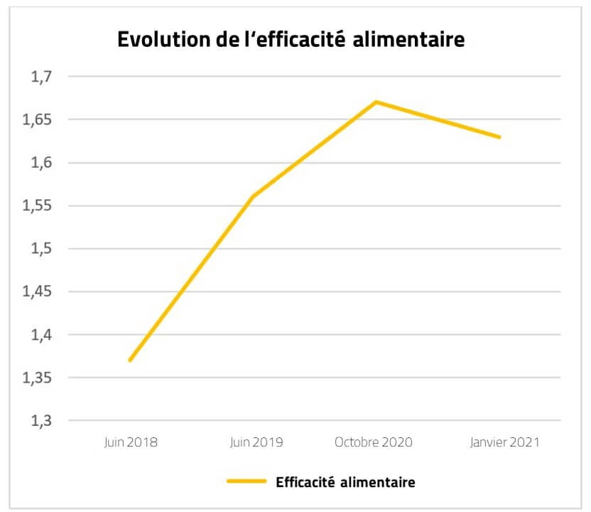 Lors du premier calcul de la ration, cette dernière semble initialement être plus chère et la « marge sur coût alimentaire » (IOFC = Income over feed cost) est réduit. Toutefois, le tableau montre que cette valeur doit être réévaluée avec le temps, car une ration moins chère ne permet pas toujours d’obtenir le meilleur rendement. Dans ce cas pratique, le rendement de l’exploitation augmente de 6,5 kg ECM (Énergie Corrigée Lait = Production Laitière (Kg) standardisé par la matière utile), l’efficacité alimentaire de 0,3 kg de lait/kg de MS. En moyenne, une vache produit donc 0,3 kg de lait en plus par kg de fourrage ingéré.